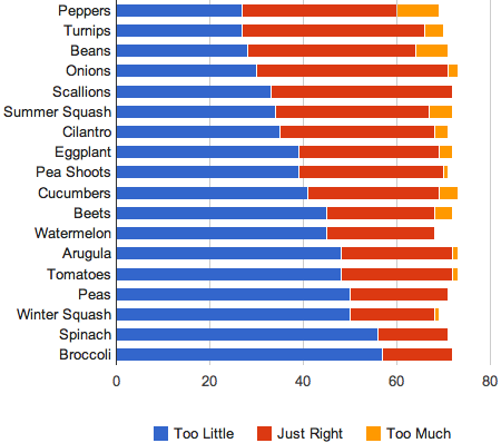 We are going to focus on the staple crops and slightly reduce the variety we offer . The crops that we are discontinuing either yield unsubstantial amounts (hot peppers, shallots, edible flowers), or are extremely costly and labor-intensive to grow (celery) or to harvest (beans). We hope that eliminating these crops will allow us to grow more delicious favorite staples in greater abundance. Please see below for a complete list of crops offered in 2011.