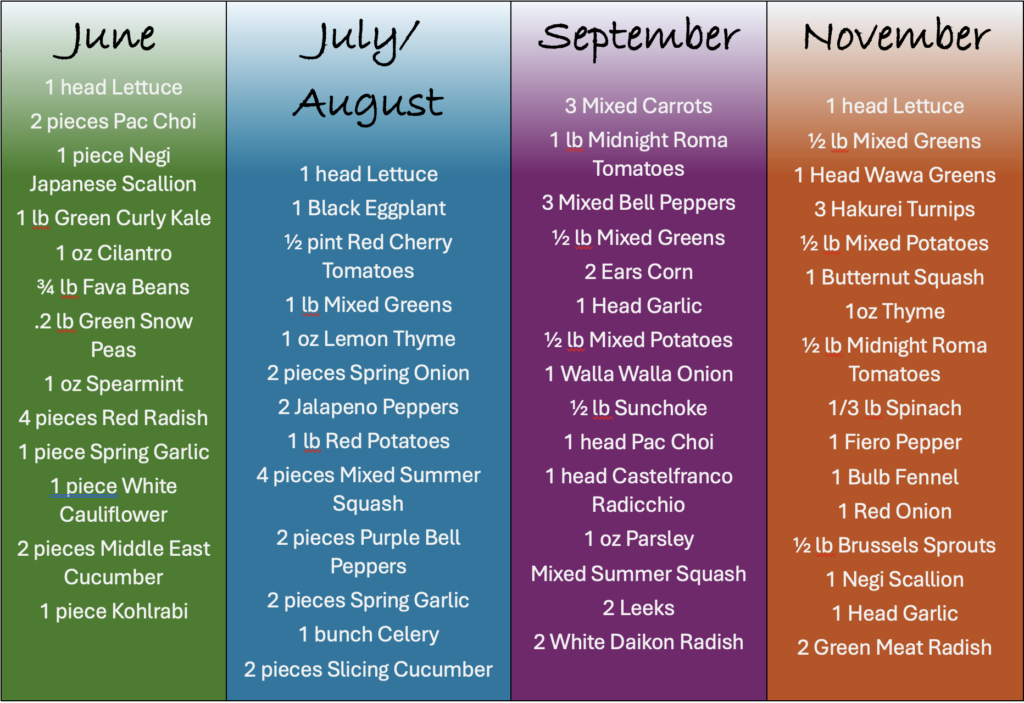 Each share comes pre-packed in a sturdy cardboard box and contains 8-12 different items, weighing up to 25 lbs., tending to be lighter at the beginning of the season and heavier as the growing season gets going. The following are examples of share contents at different points during the season. Actual contents will differ in selection and quantity.